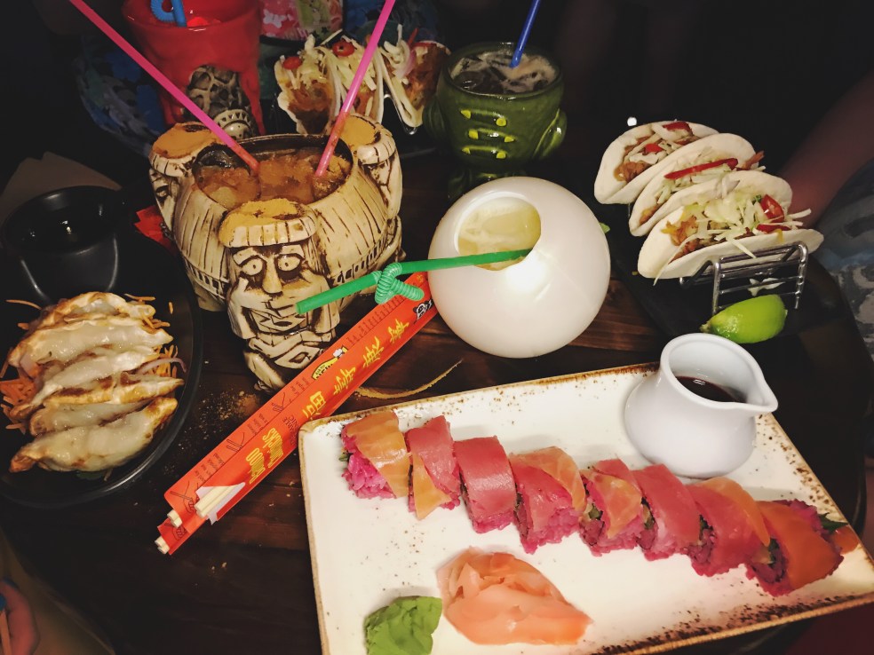 We walked right into to Trader Sam’s Grog Grotto, which surprised me – though I suppose it was early on a Wednesday evening, and the hype has likely died down by now. We each got an appetizer and a drink, and it was delicious. Above that, the atmosphere was out of this world (each drink has a specific presentation when made, so everyone is all oooh and ahhh at what you ordered), and the service was so fun and enjoyable. 10/10 would visit again. I got the Polynesian Pearl, which was almost sort of sensual, with a cinnamon bite in every sip, along with the Headhunter Sushi roll, which was a blend of tuna and salmon, with a sweet sauce on the side for dipping. Absolutely delicious.