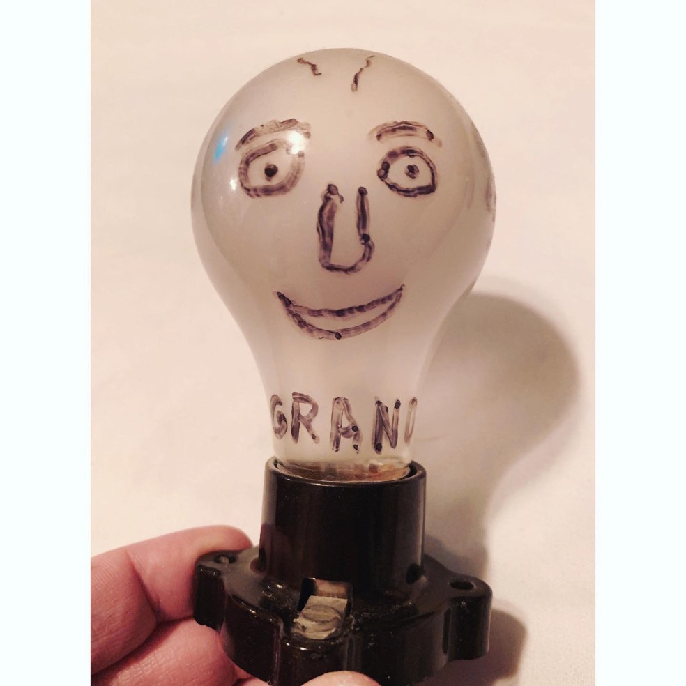 When I was very little, I told my Grand that he was “bald as a lightbulb”. In return, he gifted me … a lightbulb. With his likeness drawn on it. I have kept that lightbulb for over 25 years, and today, the wonderful Wren at Reckless Heart Tattoos in Greenville was kind enough to tattoo that lightbulb (now and forever known as #Grandbulb) on me. I told him I was getting it before I went, and asked him if he liked the idea. A routine hater of my tattoos, I was surprised when he immediately blinked once to tell me yes. After I got it, I came back to show him and asked him if he liked it. He looked at it for a long time, looked back at me, and immediately shook his head no … but his eyes were bright. A “hater” till the end, my Grandbulb. 💡